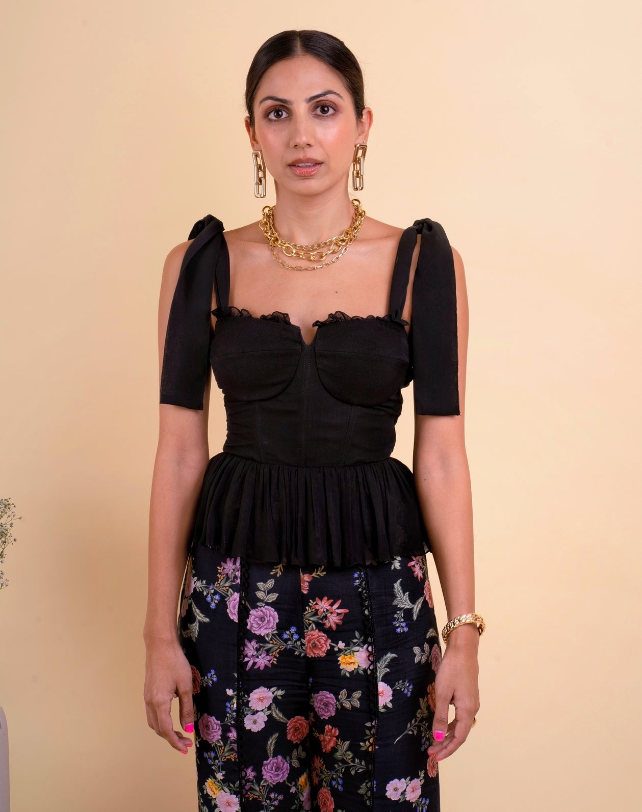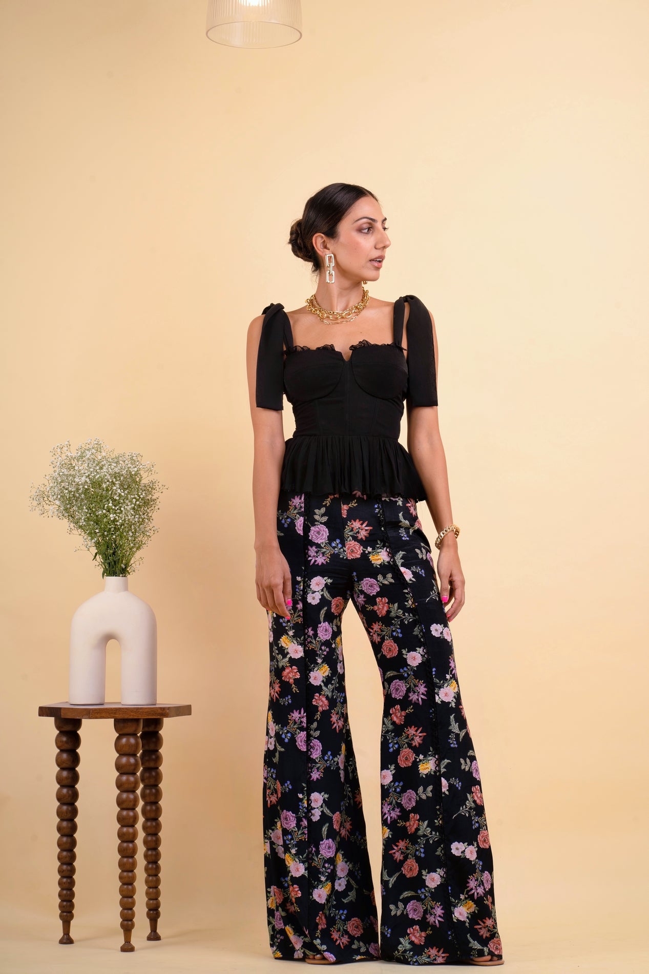 Diana Peplum corset with shoulder tie, pants in bootcup fit with delicate lace detailing