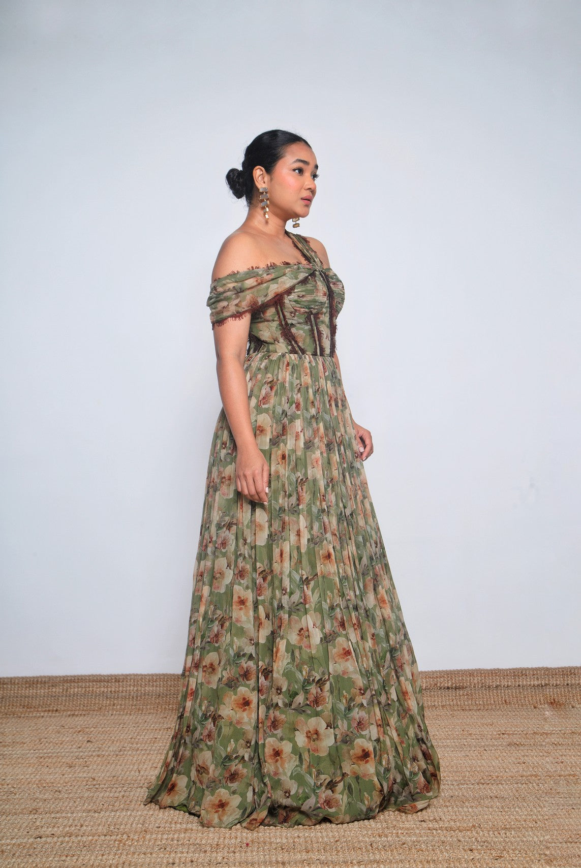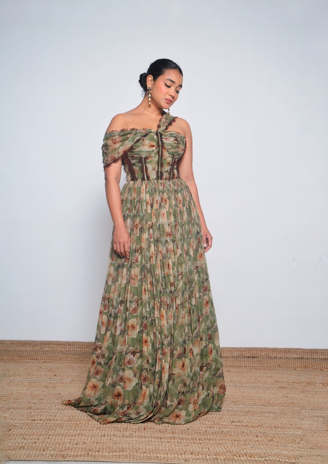 Kaimana Corset Gown with drape sleeves panelled with Chantilly lace