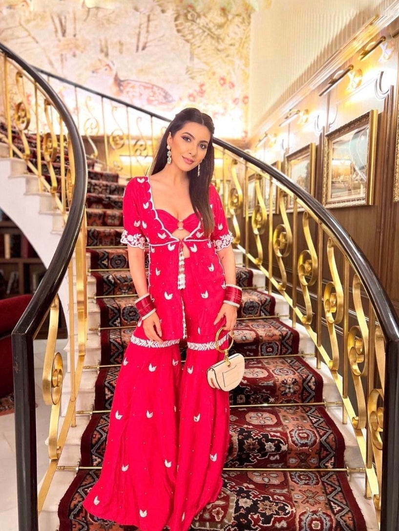 Dhalia sharara jacket with a crop top embroidered using resham, leather appliques & pearls with hand made latkans