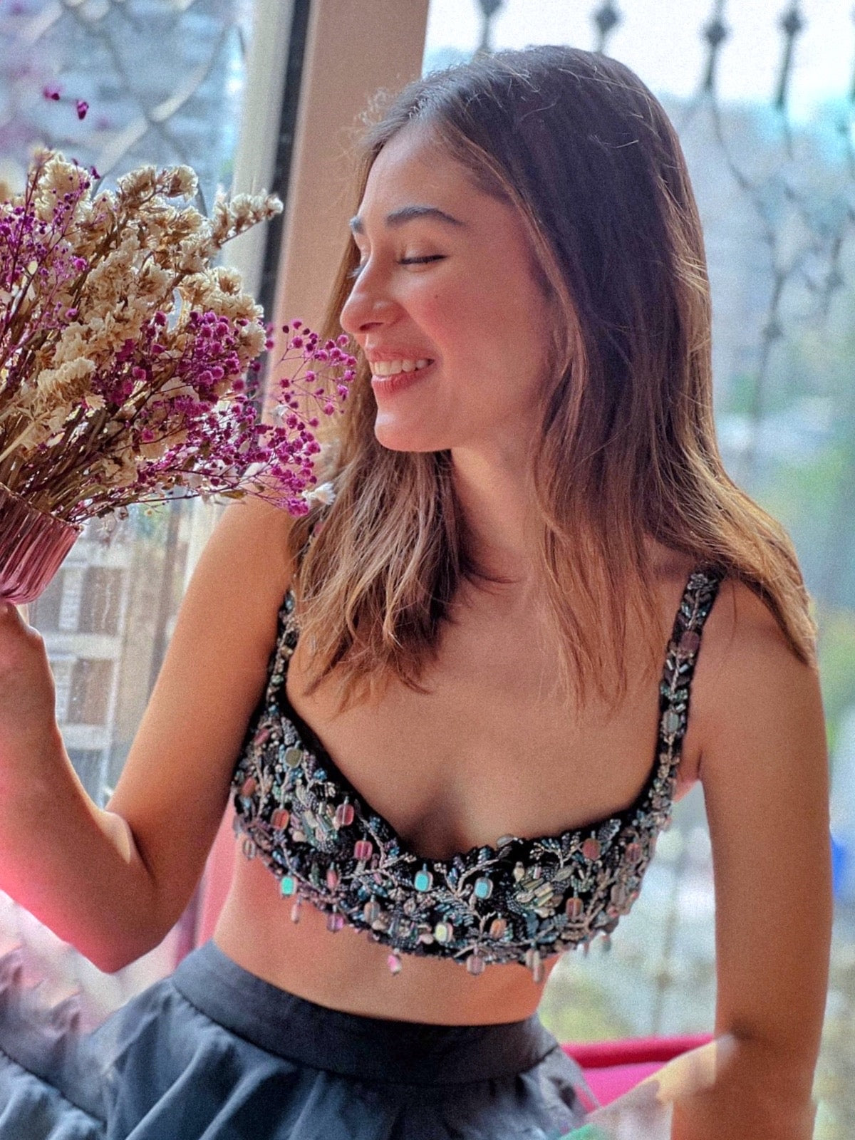 Pansy Lehenga choli in our signature hand embroidered blouse in a modern zardozi technique with crystal tassles, crystals, glass beads, sequins & pearls